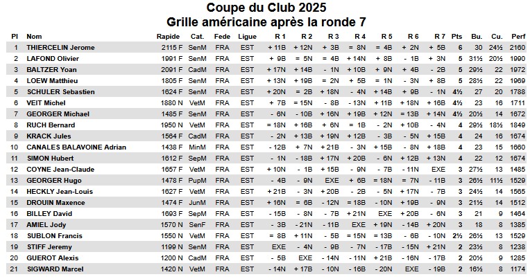 Dans le tournoi principal, Jérôme Thiercelin (6 pts sur 7) s'impose avec un point d'avance dès sa première participation. Il devance Olivier Lafond (2è), ancien membre du club et multiple vainqueur du tournoi, et Yoan Baltzer (3è), qui avait remporté les 2 dernières éditions.